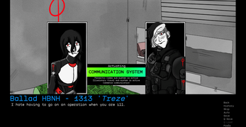 What an interesting game this was! It was so interesting how Treze and Devyan's story occurs on the periphery of a greater conflict. Parts of it feel cold, and I felt Devyan's sense of loneliness and helplessness so strongly (the lack of music and great use of atmospheric background noise really helped with this.) But there's more to it than that; Treze and Devyan have such a sweet, loving relationship, and that comes across so well in the writing, the sheer sense of warmth you can feel from the two of them together. Great work on this VN, I really enjoyed reading it!
